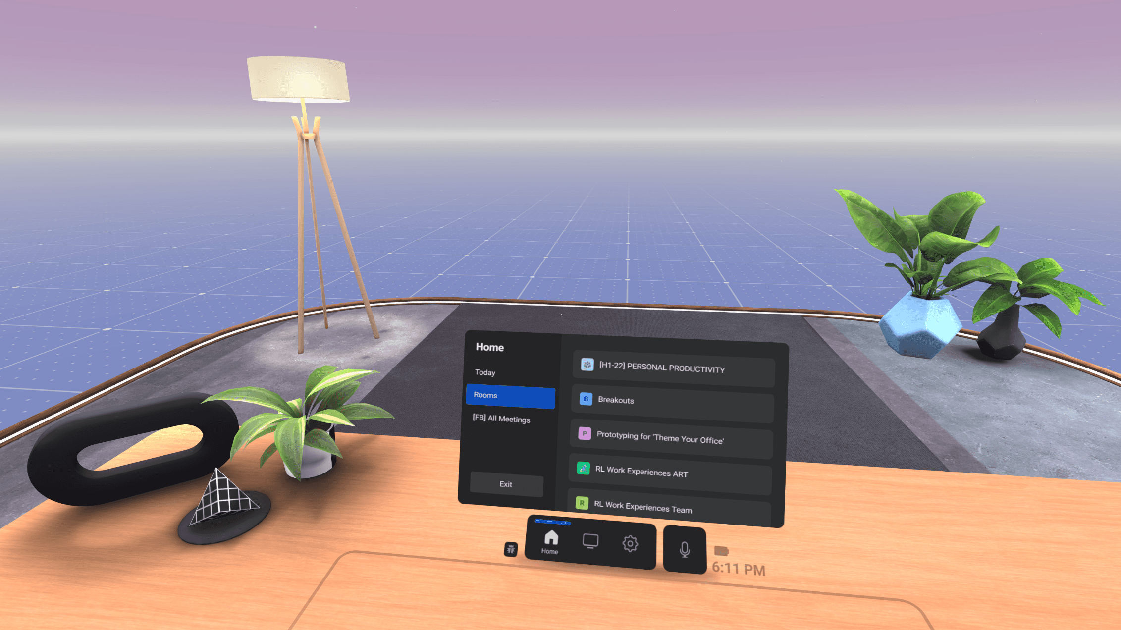I designed the first version of the Workrooms lobby in partnership with a concept artist. This was the entry space users arrived in before joining or creating meetings, and it doubled as a small workspace where they could check their schedule or organise tasks. I focused on the ambience, lighting, and overall feel of the environment to make it welcoming and easy to understand on first entry. The lobby has since evolved, but this pass established the foundation for the experience.
